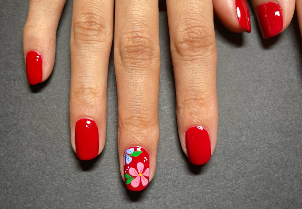 右手の中指にアクリル絵の具で「フラワー」のアートを施します。